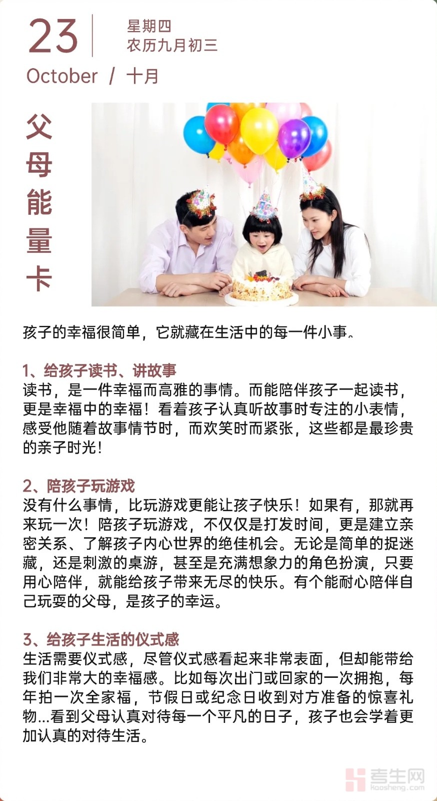 孩子的幸福,往往藏在那些看似平凡的生活碎片里。本期考生网家校共育栏目带来的 “父母能量卡”,将带您探寻如何在日常点滴中,为孩子构筑幸福的成长记忆。