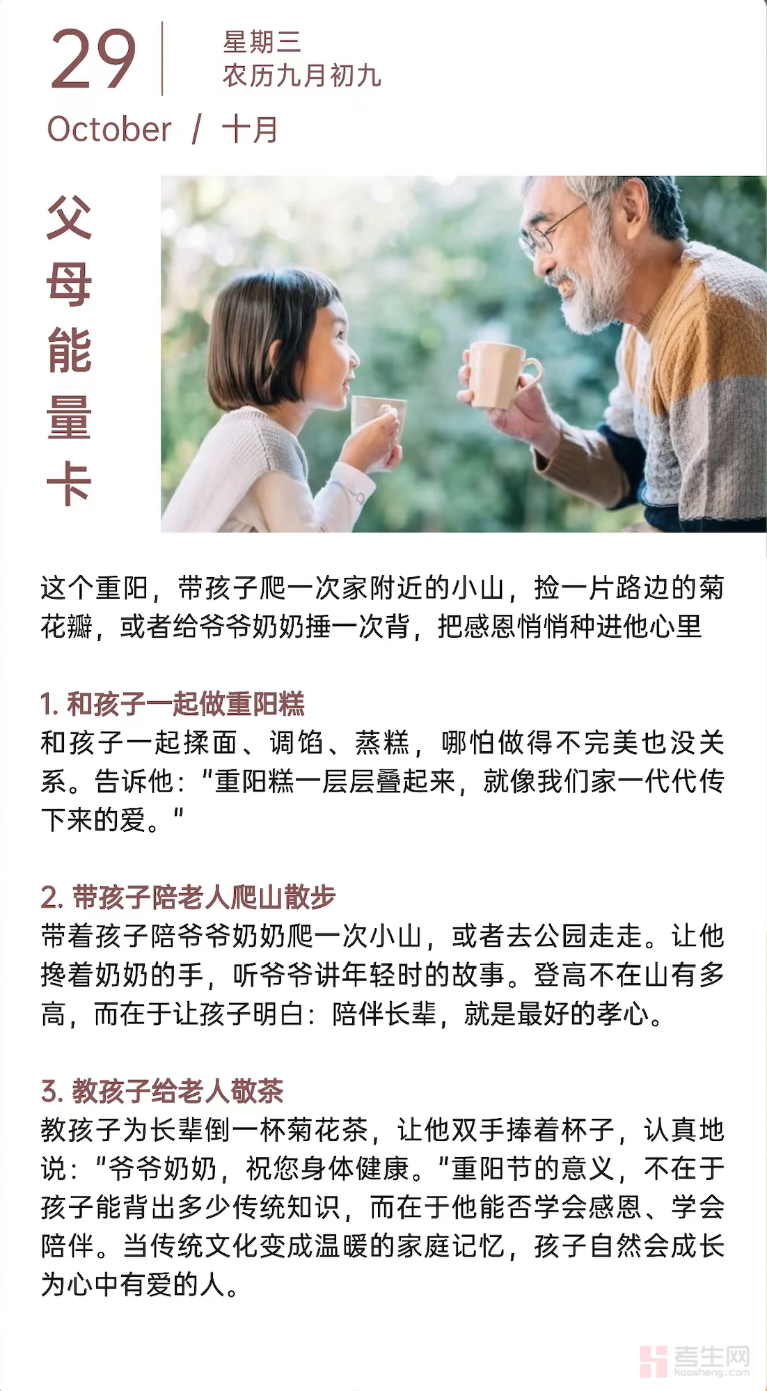 重阳节不仅是登高赏菊的传统节日,更是传递感恩与陪伴的绝佳教育契机。本期考生网家校共育栏目推出的 “父母能量卡”,为您带来重阳亲子互动的暖心指南,让孩子在传统习俗中领悟感恩,在家庭陪伴中滋养爱心。