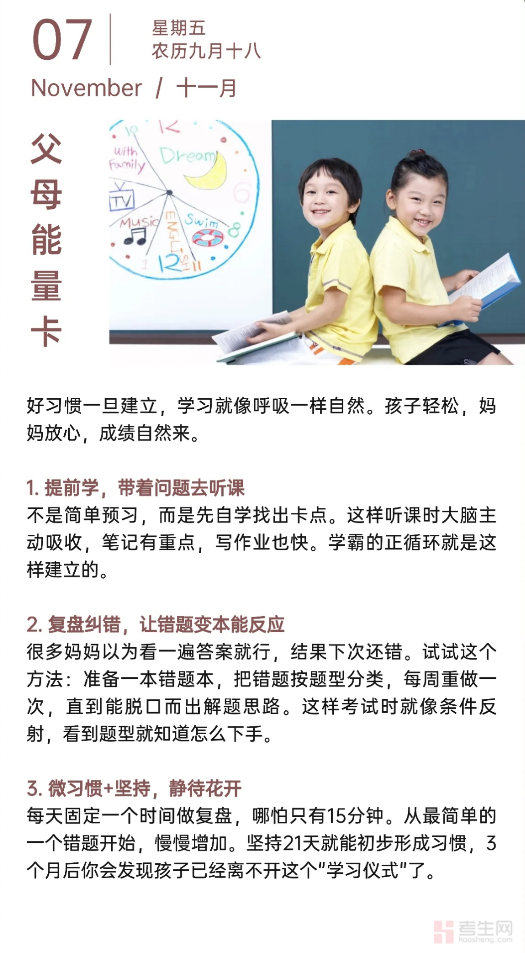 当学习成为一种自然的习惯,孩子会学得轻松,家长也能更放心。本期考生网家校共育栏目带来的 “父母能量卡”,为您分享三个打造学习好习惯的实用方法,助力孩子在良性循环中收获成长与成绩。