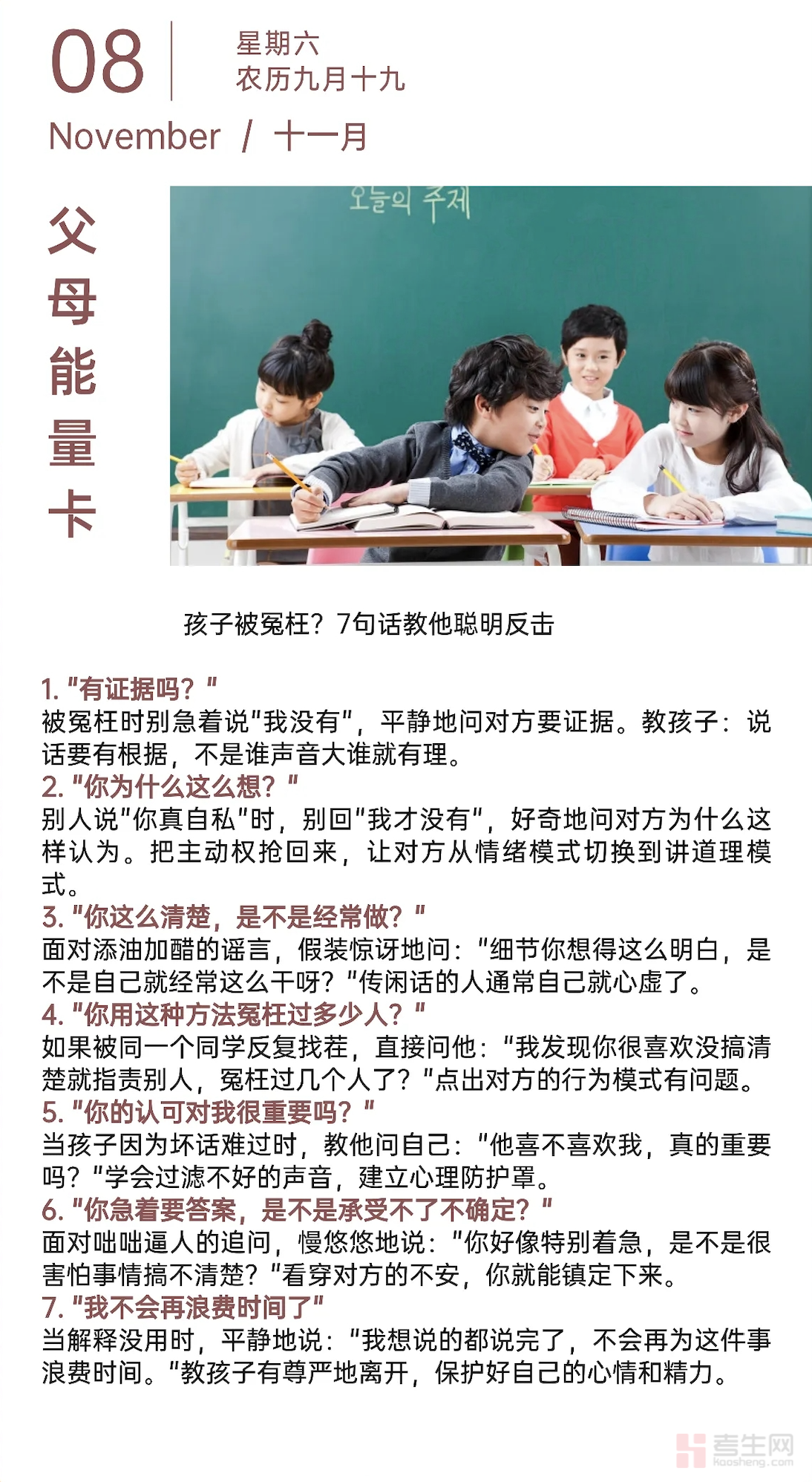 孩子在校园或生活中难免遭遇被冤枉的处境,若不懂如何应对,可能会伤害其自尊与自信。本期考生网家校共育栏目带来的 “父母能量卡”,分享 7 句实用话术,教孩子在被冤枉时聪明反击,既维护自身权益,又培养理性沟通的能力。