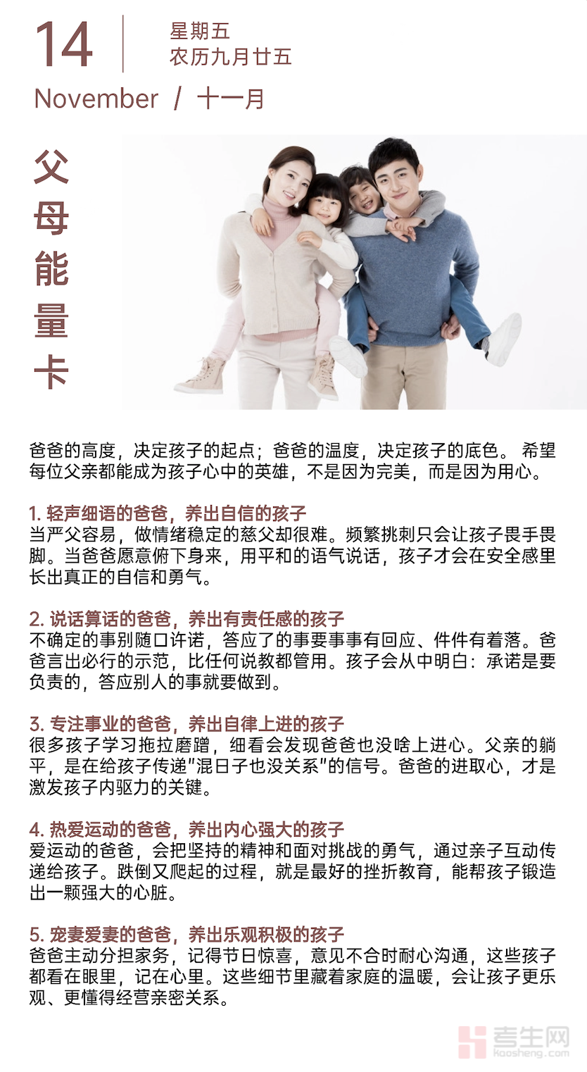 爸爸在孩子成长中扮演着独特角色:他的高度决定孩子的起点,他的温度决定孩子的底色。本期考生网家校共育栏目带来的 “父母能量卡”,聚焦父亲的教育影响力,愿每位爸爸都能成为孩子心中的 “用心英雄”。
