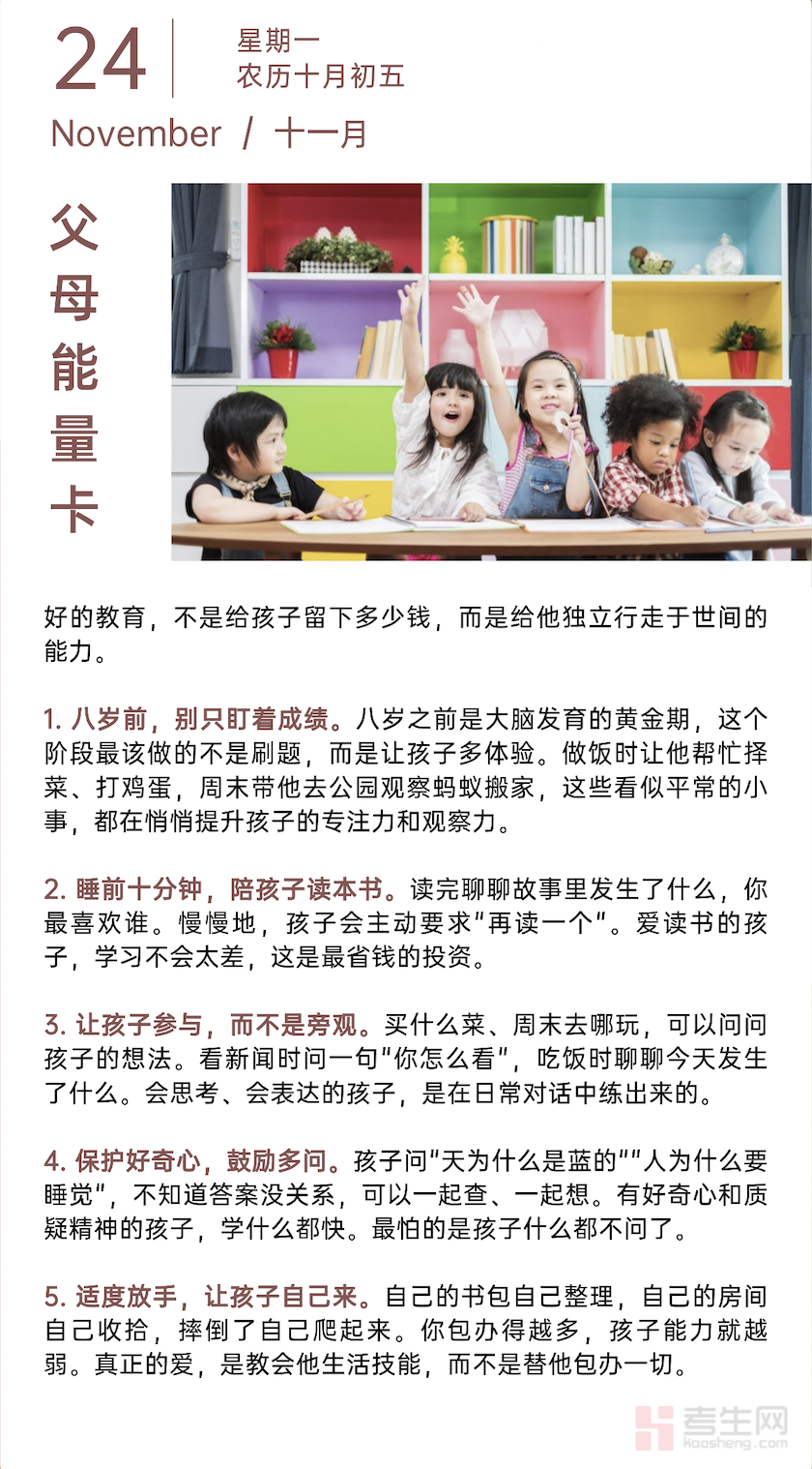 很多家长误以为给孩子留钱是最好的教育,却忽略了真正的教育是培养孩子独立行走世间的能力。本期考生网家校共育栏目带来的 “父母能量卡”,分享 5 个培养孩子独立能力的方法,助力孩子成长为能自主立足的人。