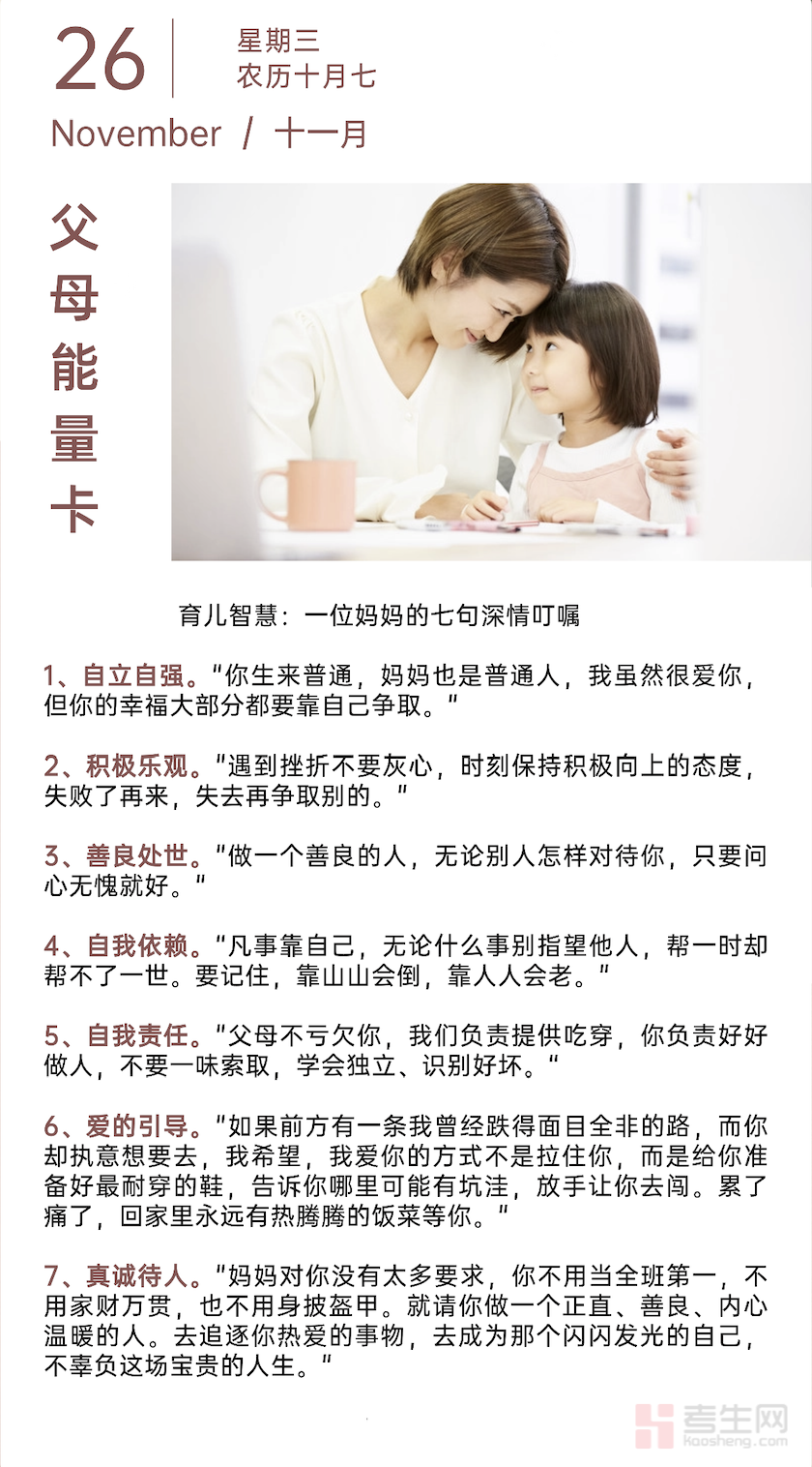 好的育儿不是说教,是把人生的底层逻辑,用温柔的叮嘱种进孩子心里。本期考生网家校共育栏目带来的 “父母能量卡”,分享一位妈妈的 7 句深情叮嘱,每一句都是给孩子的成长底气。
