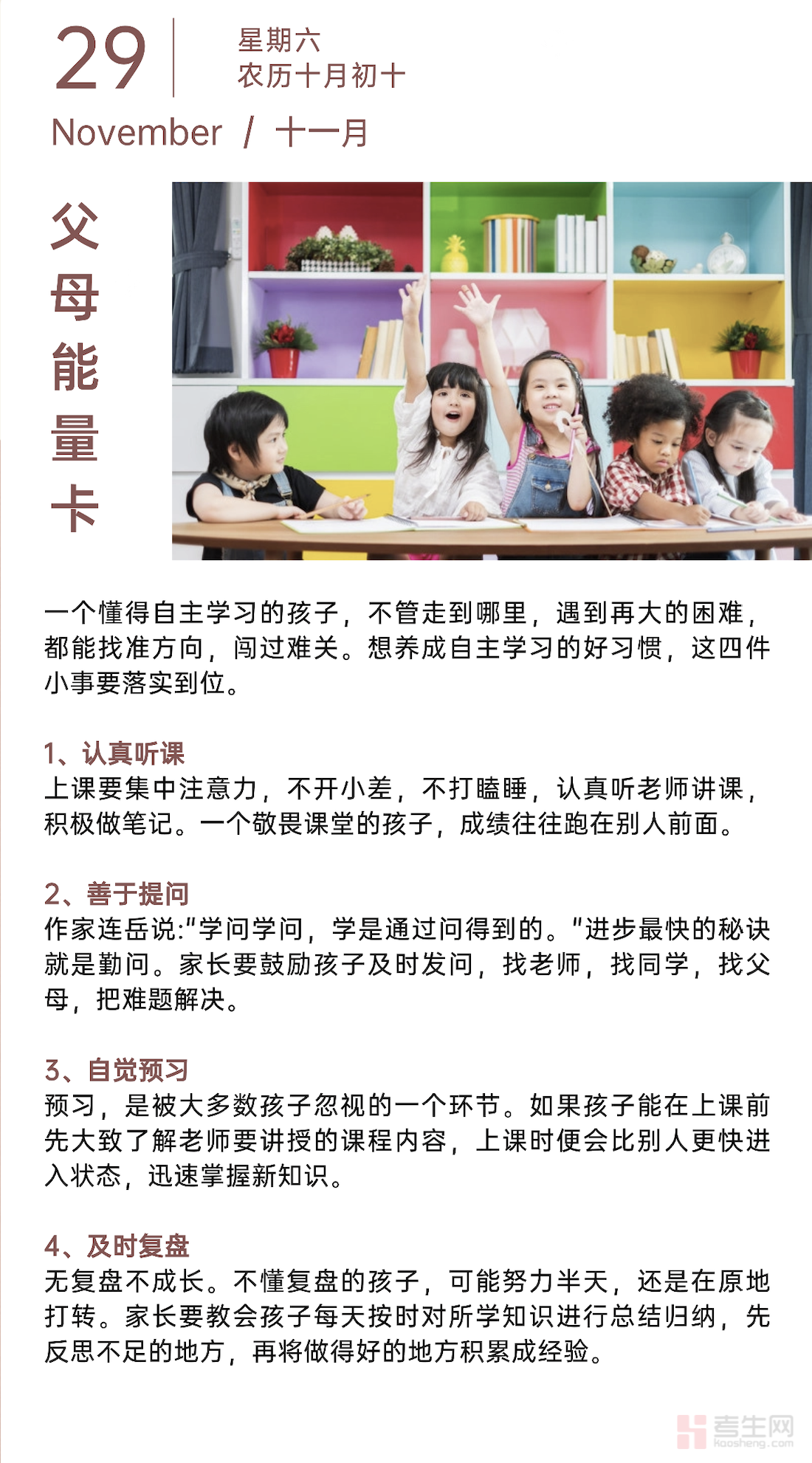 一个懂得自主学习的孩子,无论遇到什么困难都能找准方向、闯过关卡。想让孩子拥有自主学习能力,这 4 件小事要落实到位。本期考生网家校共育栏目带来的 “父母能量卡”,分享培养自主学习习惯的关键方法。