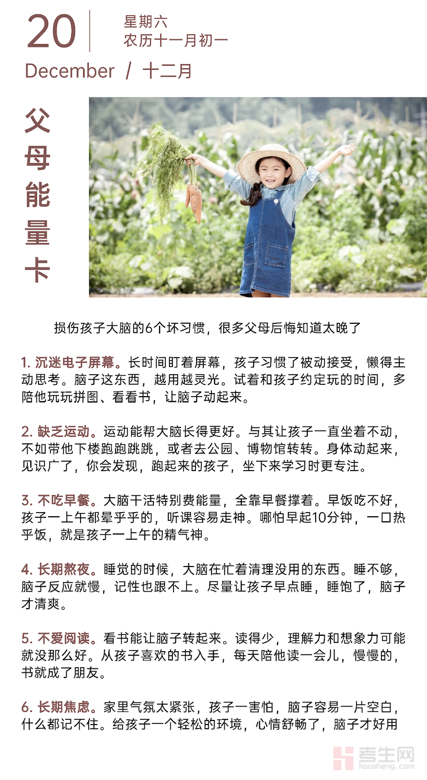孩子的大脑发育,藏在日常习惯里 —— 有些看似平常的行为,其实在悄悄影响大脑状态。本期考生网家校共育栏目带来的 “父母能量卡”,提醒你避开这 6 个损伤孩子大脑的坏习惯: