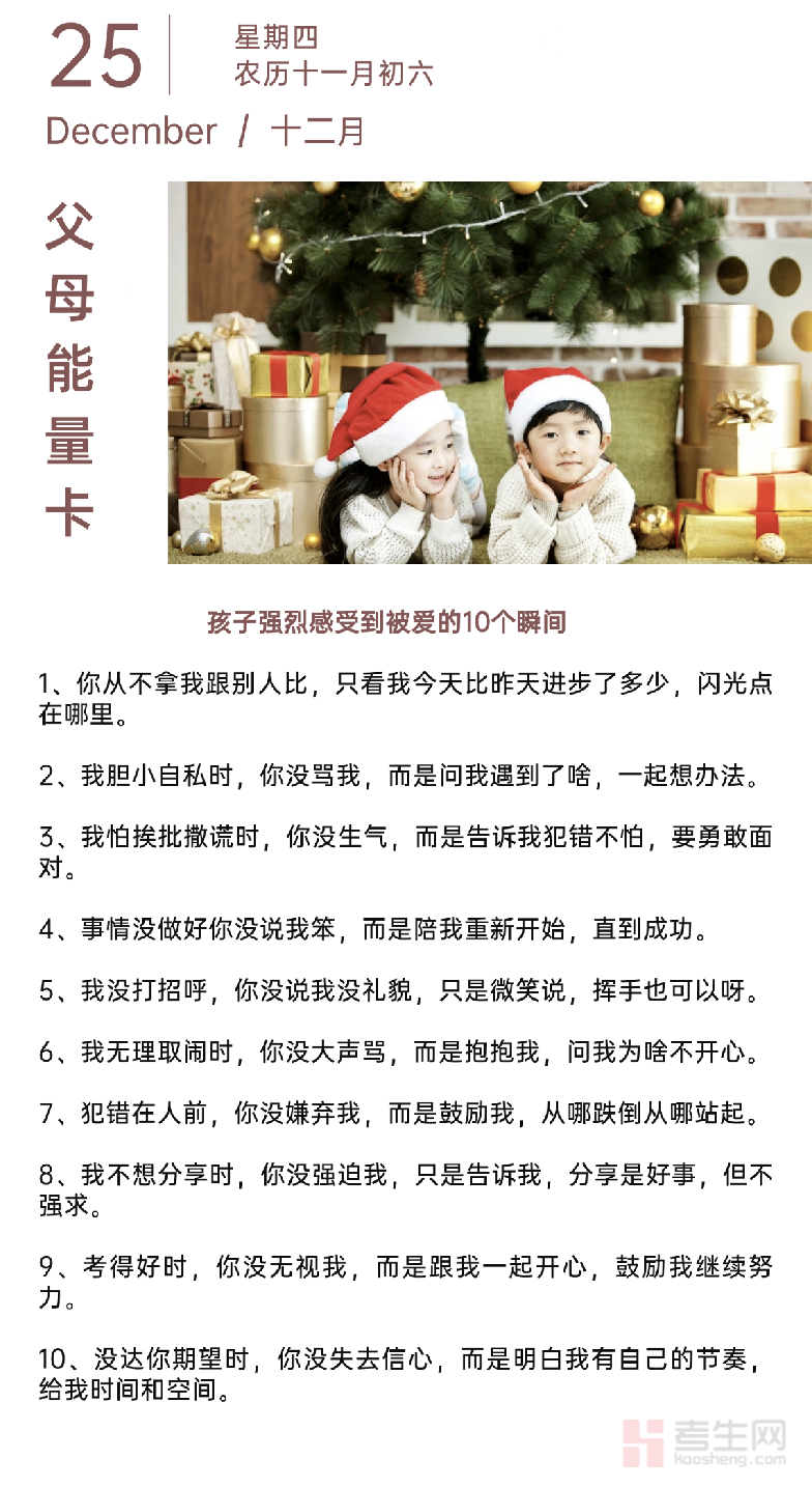 孩子对 “被爱” 的感知,从不是靠昂贵的礼物,而是藏在日常相处的细节里。本期考生网家校共育栏目带来的 “父母能量卡”,分享 10 个让孩子真切感受到爱的瞬间: