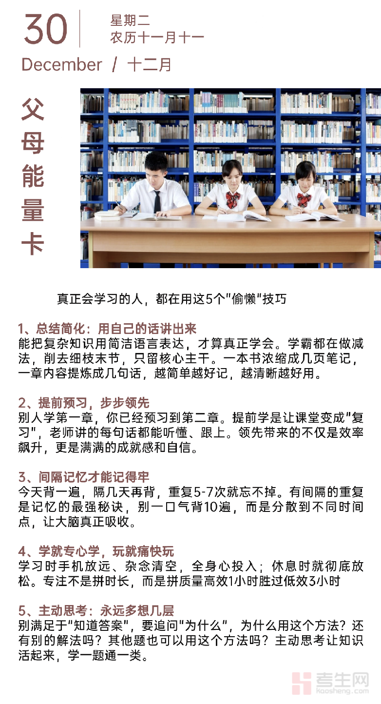 很多孩子学习累,不是不够努力,是没找对 “省力” 的方法。真正会学习的人,都在用这 5 个 “偷懒” 技巧 —— 看似省劲儿,实则效率翻倍。本期考生网家校共育栏目带来的 “父母能量卡”,分享这些实用学习技巧: