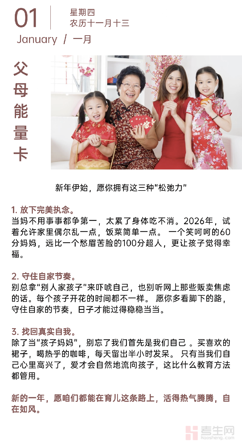 育儿的路上,我们总习惯逼自己做 “满分父母”,但其实 “松弛” 才是更好的养育状态。新年刚开始,本期考生网家校共育栏目带来的 “父母能量卡”,分享 3 种能让你和孩子都更舒服的松弛力: