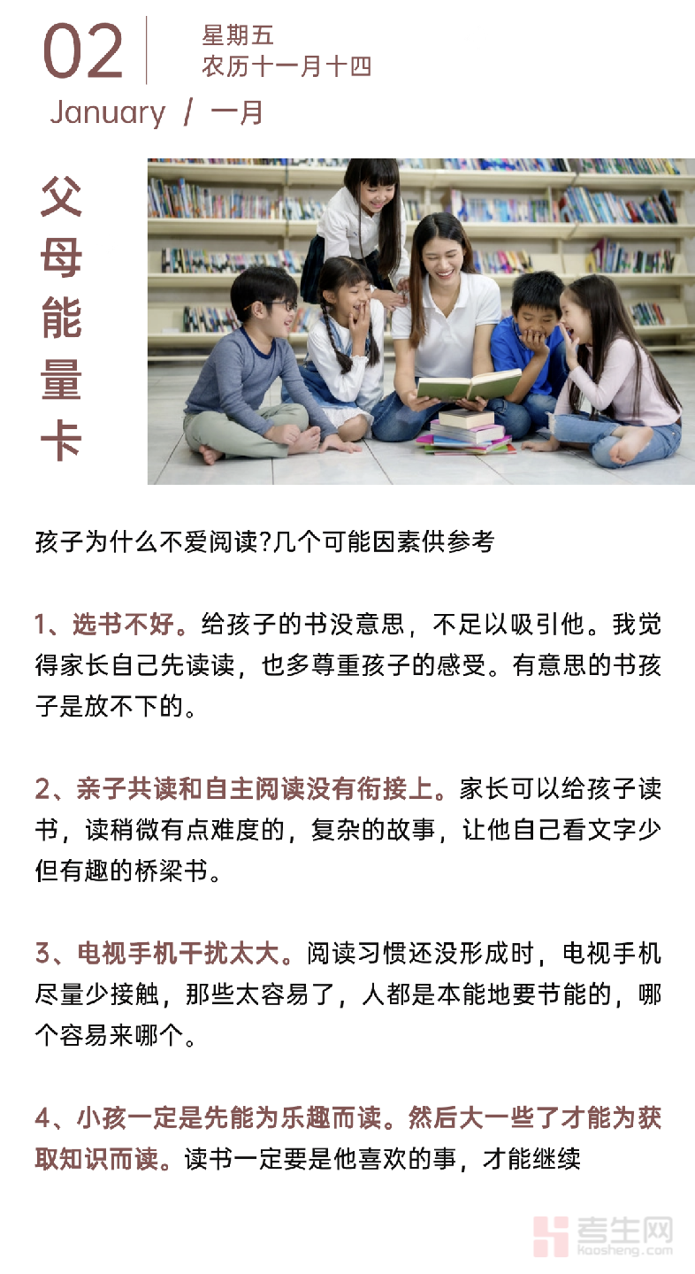 很多家长发愁 “孩子不爱读书”,其实问题未必在孩子,而是没找对根源。本期考生网家校共育栏目带来的 “父母能量卡”,帮你拆解孩子不爱阅读的 4 个常见原因: