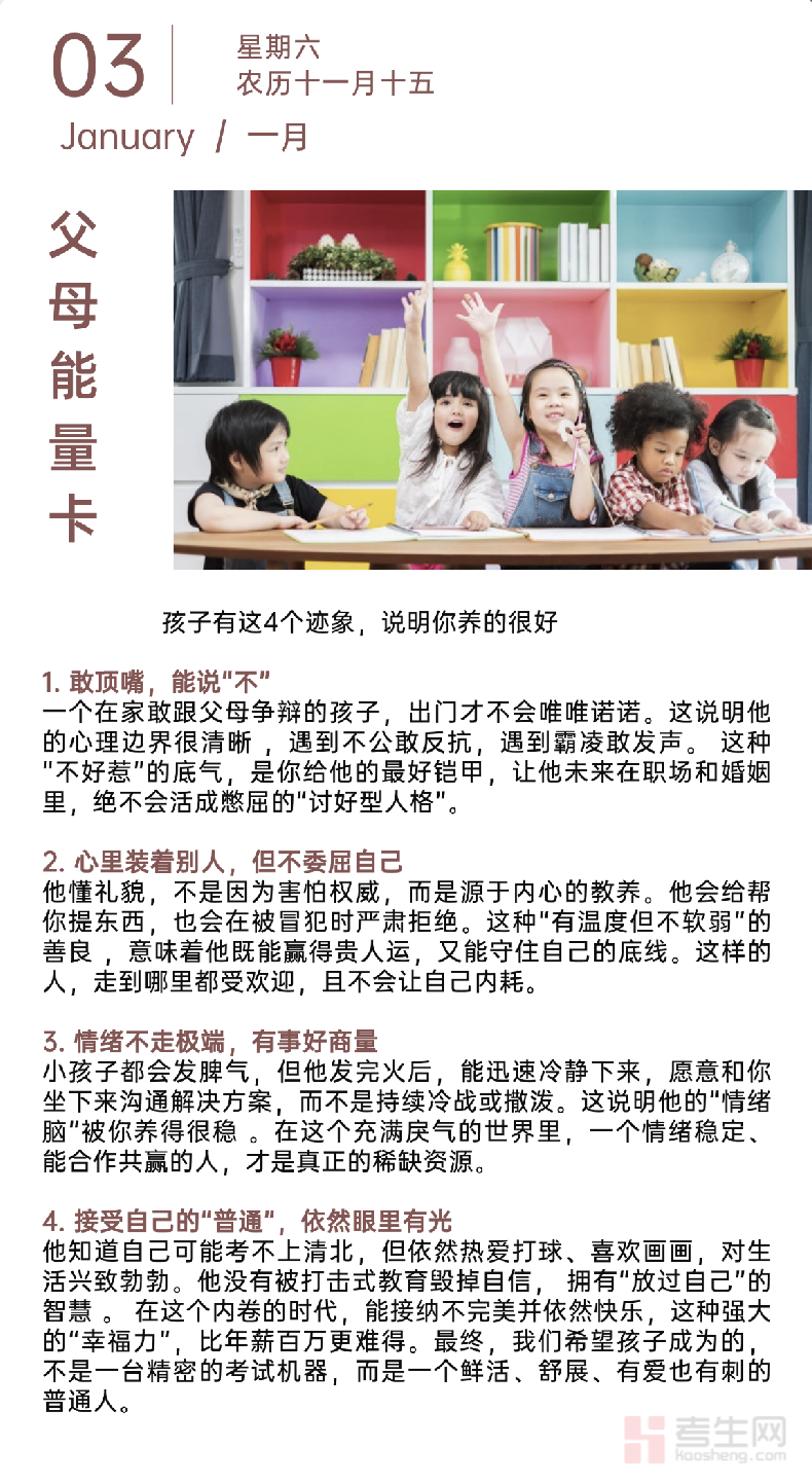 不用总盯着成绩焦虑,孩子身上这 4 个迹象,藏着你养育的温度与智慧。本期考生网家校共育栏目带来的 “父母能量卡”,帮你看见这些珍贵的成长信号: