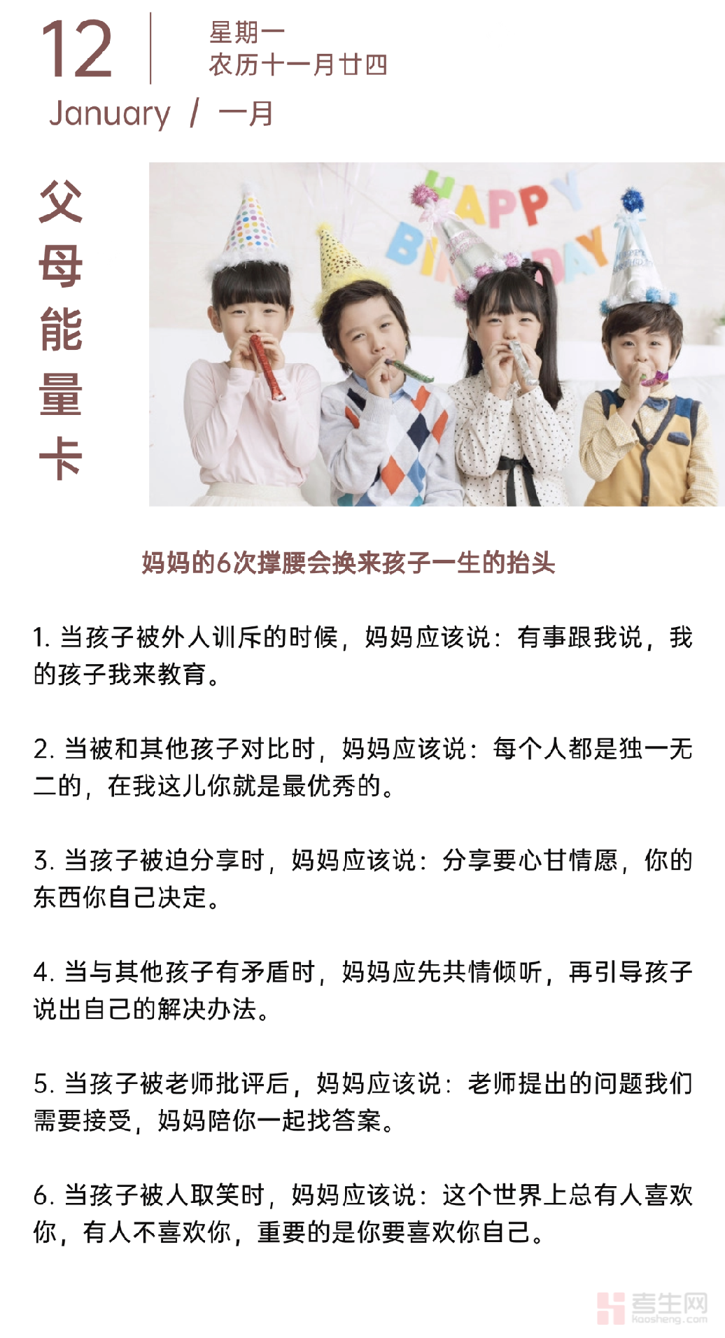 孩子的自信,藏在妈妈每一次站在他身边的瞬间里。妈妈的 6 次 “撑腰”,会让孩子敢抬头、有底气。本期考生网家校共育栏目带来的 “父母能量卡”,分享这些关键场景的撑腰方式: