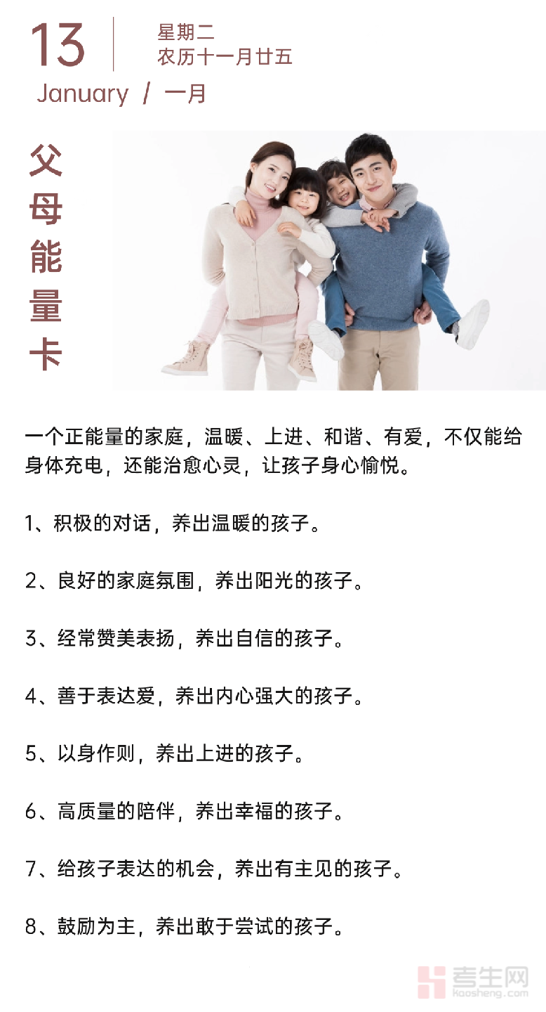 一个温暖、上进的家庭,是孩子最好的 “充电站”—— 不仅能暖身体,更能治愈心灵。本期考生网家校共育栏目带来的 “父母能量卡”,分享 8 个打造正能量家庭的细节: