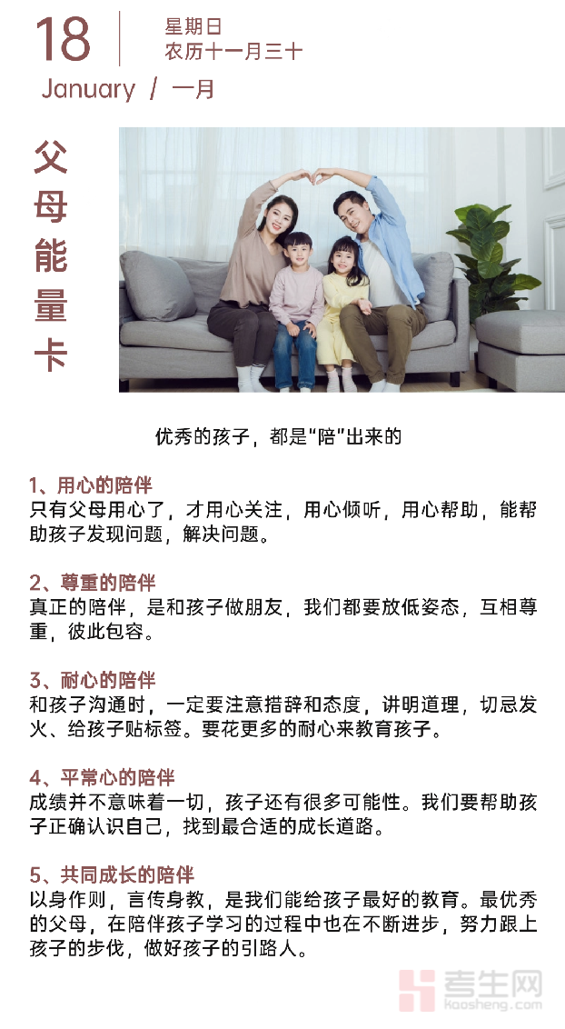 好的教育从不是 “教” 出来的,而是 “陪” 出来的。高质量的陪伴,是给孩子最好的底气。本期考生网家校共育栏目带来的 “父母能量卡”,分享 5 种让陪伴更有效的方式: